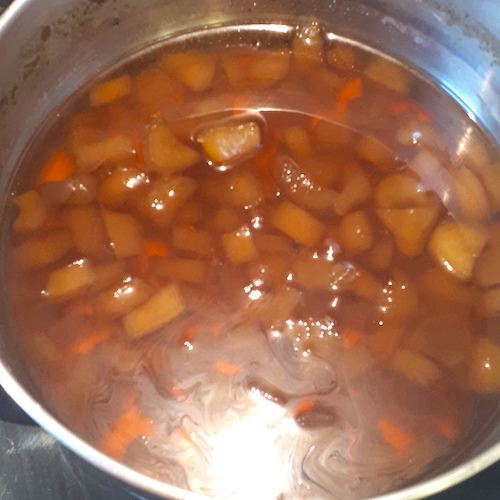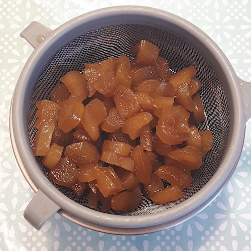 12.Réchauffer le mélange pour que le sirop redevienne plus liquide et qu’il soit plus facile d’égoutter les morceaux de gingembre confit.
