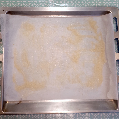 7.Préparer une plaque en la recouvrant de papier cuisson et de sucre.