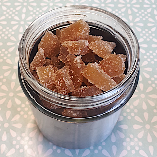 18.Verser les morceaux de gingembre confit dans un bocal hermétique. Conservés ainsi, ils se garderont plusieurs mois (si les gourmands ne les dévorent pas tous d’ici-là!).