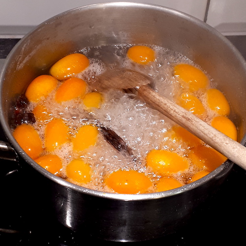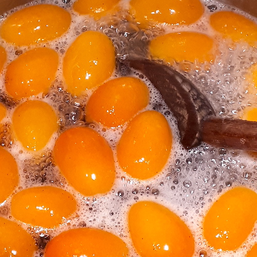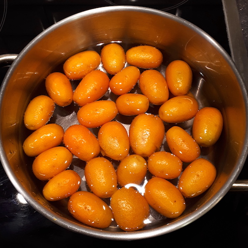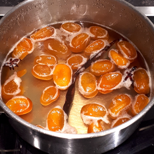 6.Ajouter les kumquats et laisser cuire environ 45 minutes. Vous pouvez aussi procéder en plusieurs fois comme pour le gingembre confit (5-10 minutes de cuisson, 1-2 jours de repos, etc.). Ne pas hésiter à ajouter une gousse de vanille ou de la badiane dans le sirop pour lui donner plus de saveur.