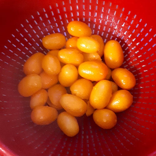 4.Égoutter et répéter le point 3. encore deux ou trois fois. Blanchir les kumquats permet d’en ôter l’amertume.