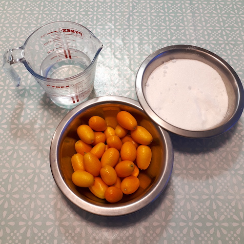 - 50cl d’eau + eau pour rincer et blanchir les kumquats