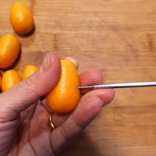 2.Percer délicatement la peau des kumquats à plusieurs endroits afin que le sirop puisse confire les fruits de l’intérieur.
