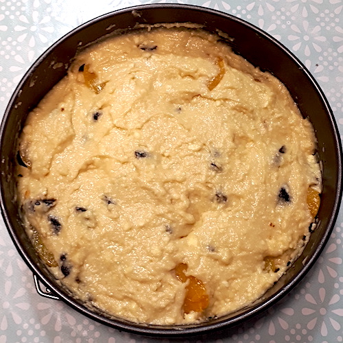 9.Verser délicatement le mélange dans le moule sur les moitiés d’abricots en essayant de ne pas les déplacer.