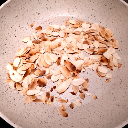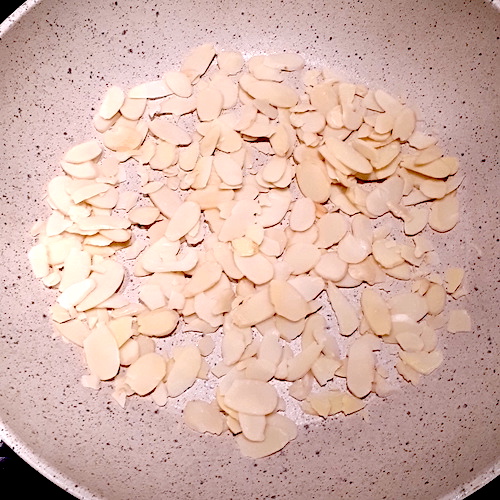 11.Pendant ce temps, torréfier les amandes concassées (ou effilées) quelques minutes dans une poêle à sec et réserver.
