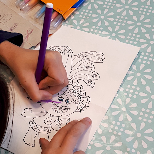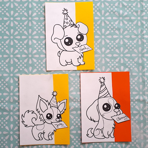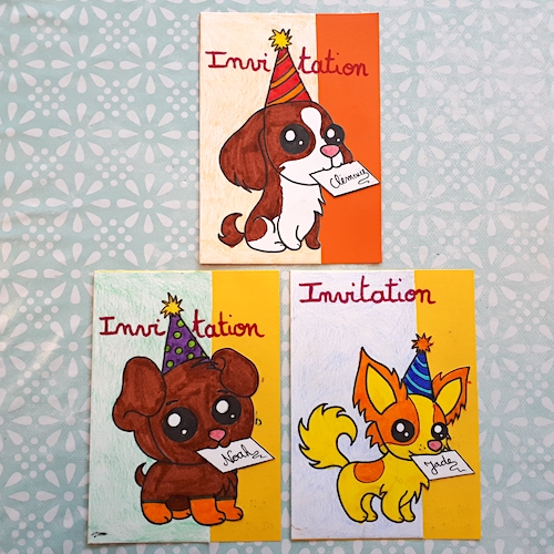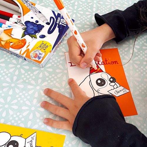J’essaye de suivre le thème de leur fête (s’il y en a un) ou simplement leurs envies. Si je m’occupe du dessin, ce sont les filles qui se chargent du coloriage, elles participent ainsi activement à la réalisation des cartes.