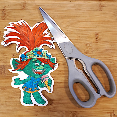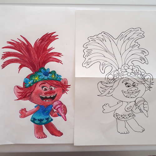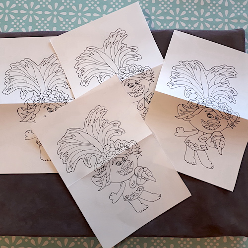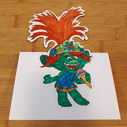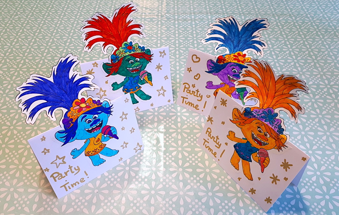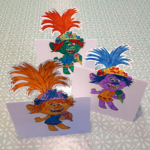 Ci-dessous, à titre d’exemple, voici les différentes étapes de la réalisation des cartes «Poppy» (personnage du dessin animé «Trolls») pour le dernier anniversaire de ma fille aînée:
