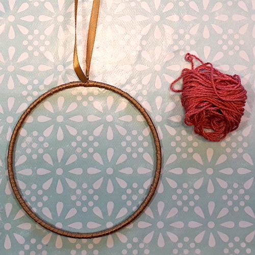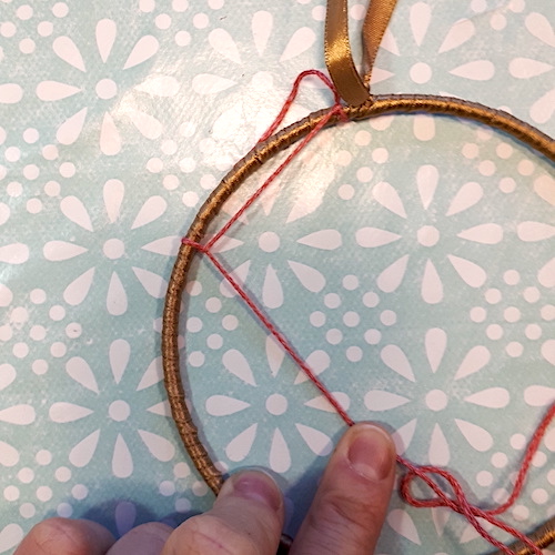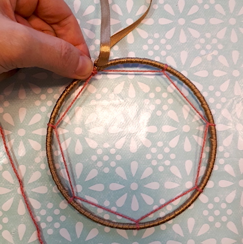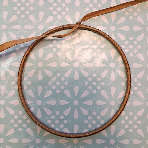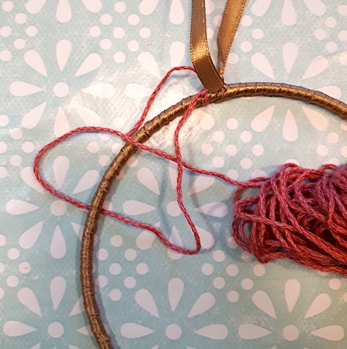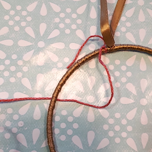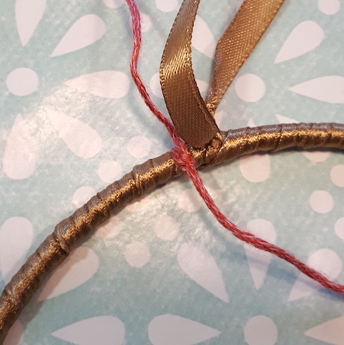 3.Lorsque vous avez fait le tour du cercle, attacher la laine/le ruban au morceau que vous aviez laissé dépasser au début.