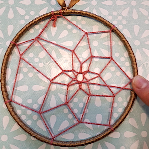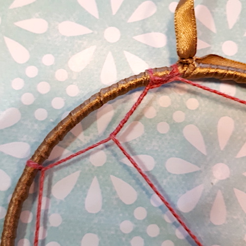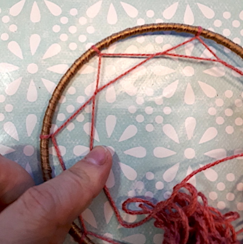 6.Pour le tissage, enrouler le fil autour du cercle en laissant des espaces réguliers. Pour cela, passer le fil derrière le cercle (à l’endroit choisi pour l’emplacement du nœud) avant de le faire passer par-dessus puis dans la boucle ainsi formée.