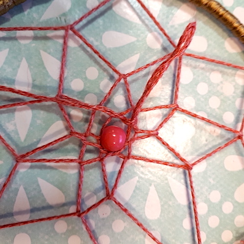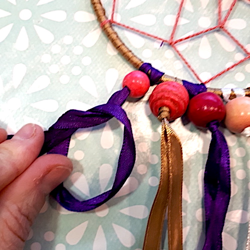 13.Fixer tous les rubans les uns à côté des autres en alternant les styles, les couleurs, les longueurs. Pour cet attrape-rêves j’ai passé des grosses perles sur chaque double ruban et je les ai fixées avec un nœud.