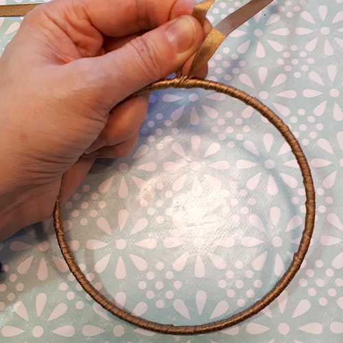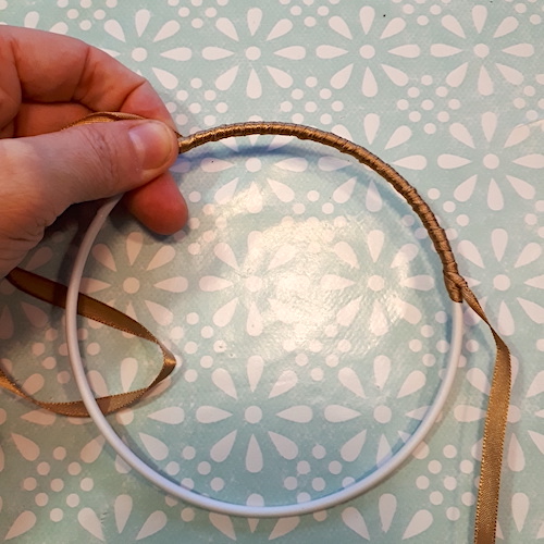 2.Entourer tout le pourtour du cercle avec la laine/le ruban (il faut que ce soit suffisamment serré pour tenir). Si vous utilisez du ruban comme moi, n’hésitez pas à faire passer une partie du ruban sur le tour précédent, cela permet d’éviter les « trous ». NB: si le fil/le ruban ne tient pas en place, vous pouvez mettre quelques points de colle forte sur le cercle pour aider à le fixer (sans en abuser!).