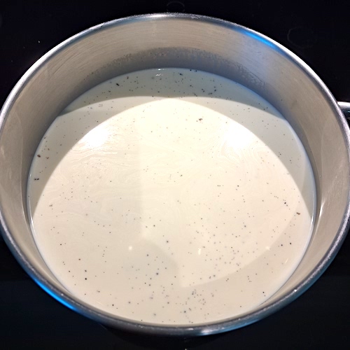 NB: N’oubliez pas, la veille de la réalisation du flan à la vanille, d’ouvrir la gousse de vanille en deux, d’enlever les grains et de les mettre à infuser ainsi que la gousse dans le mélange crème-lait (voir étape 1).