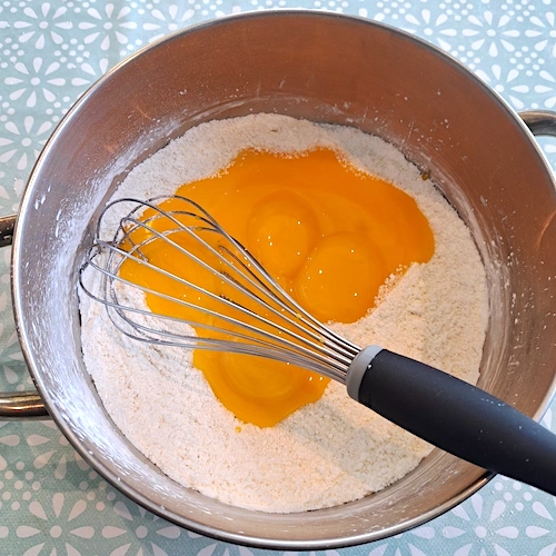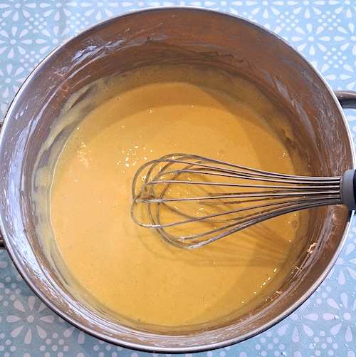 6.Ajouter les jaunes d’œufs et fouetter le mélange pour enlever les grumeaux et le rendre homogène.