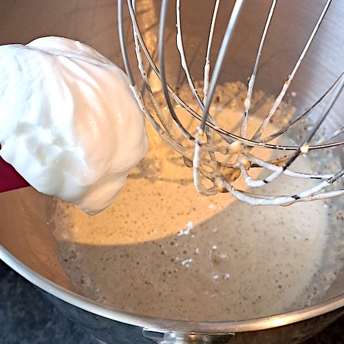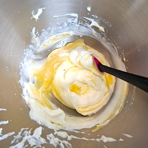 4.À l’aide d’une maryse, incorporer un peu de blancs d’œufs en neige dans le mélange précédent.