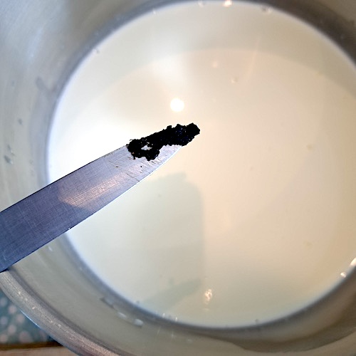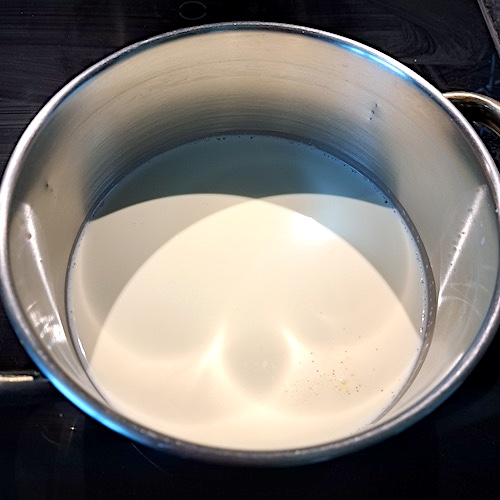 3.Porter le lait à ébullition avec la gousse de vanille fendue et les grains.