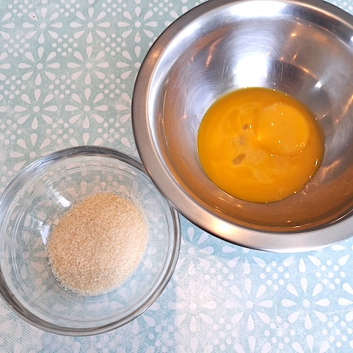 2.Dans un bol, mélanger les jaunes d’œufs et le sucre.