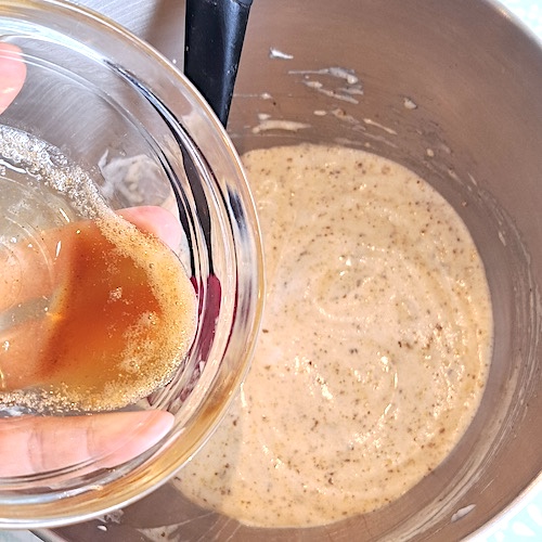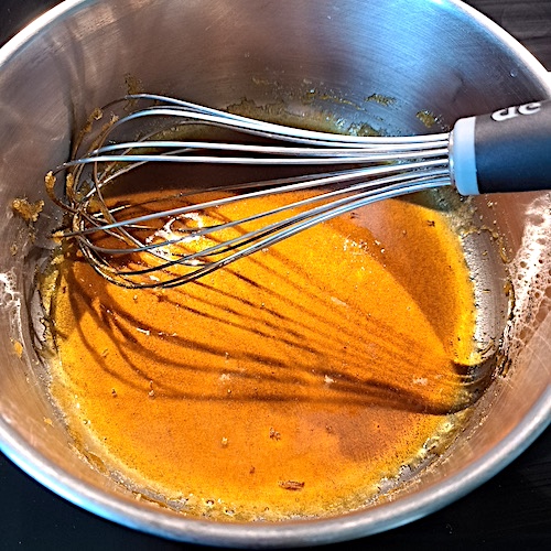 3.Verser dans le caramel et mélanger vigoureusement (attention aux éclaboussures)