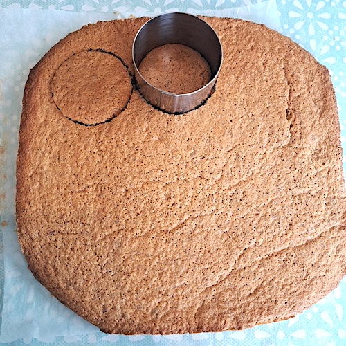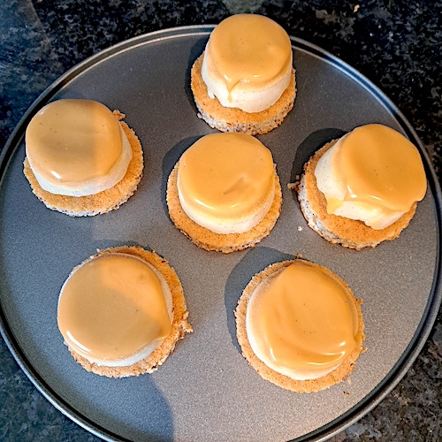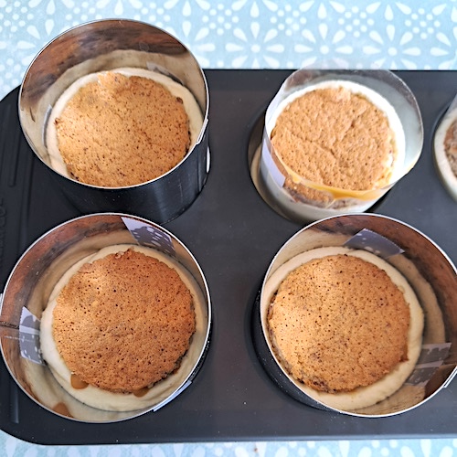5.Poser un cercle de biscuit mœlleux sur chaque insert et démouler.