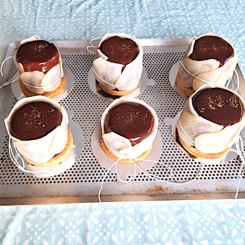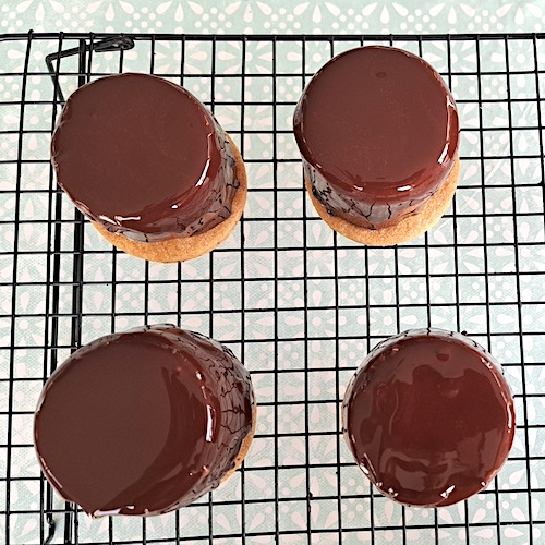 4.Verser le glaçage sur les entremets glacés (attention à bien couvrir tous les côtés).