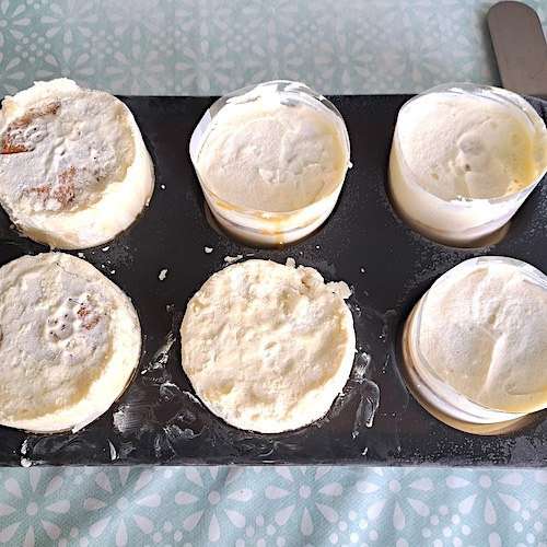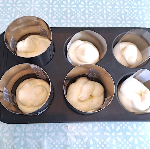 (NB: J’ai tenté pour l’occasion de « modifier » des moules à muffins en y attachant des cercles pour plus de hauteur, je déconseille fortement, le démoulage était si compliqué que j’ai du m’aider d’un couteau ce qui a ruiné mon moule…)