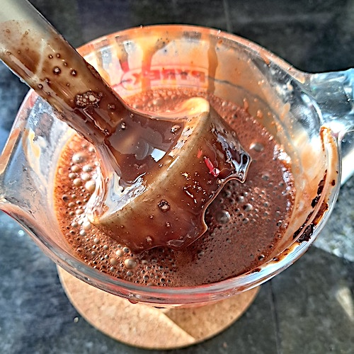 3.Hors du feu, ajouter la gélatine essorée. Utiliser le mixer plongeant pour bien homogénéiser la préparation.