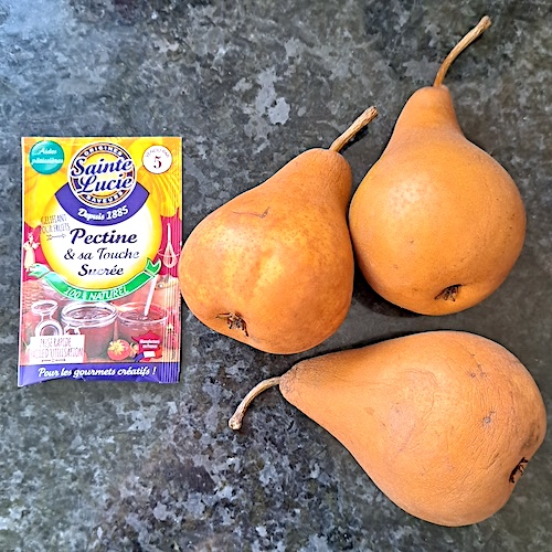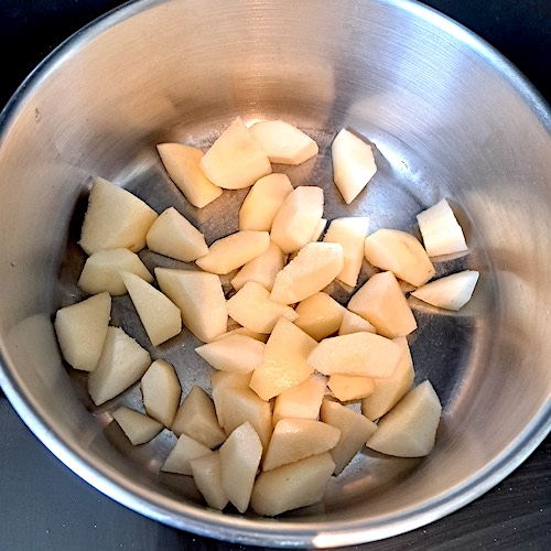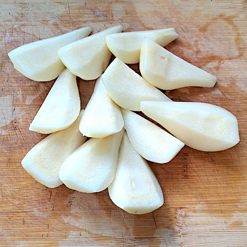 1.Éplucher et tailler trois poires en gros morceaux.