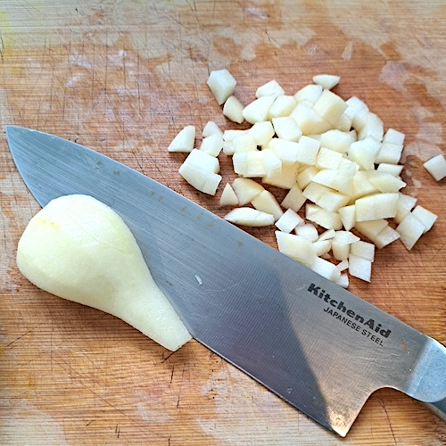 4.Éplucher les deux poires restantes et tailler en petits dés.