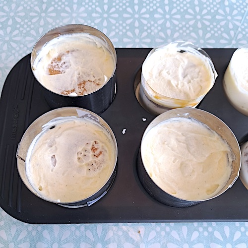 6.Dans le fond des cercles, pocher la bavaroise vanille (environ jusqu’à mi-hauteur).