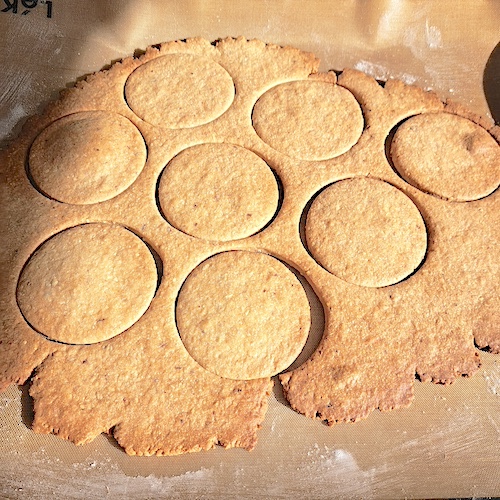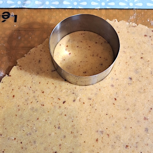 10.À l’aide d’un cercle d’un diamètre supérieur à celui de vos entremets (d’environ 2cm), emporte-piécer 6 cercles (ou plus) sans les retirer du reste de la pâte.