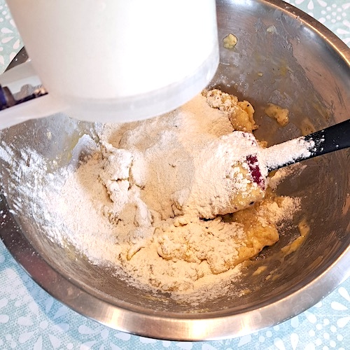 6.Tamiser la farine dessus et continuer à mélanger sans trop travailler la pâte.