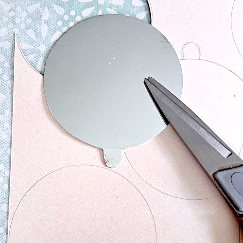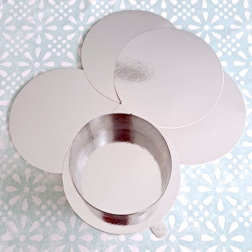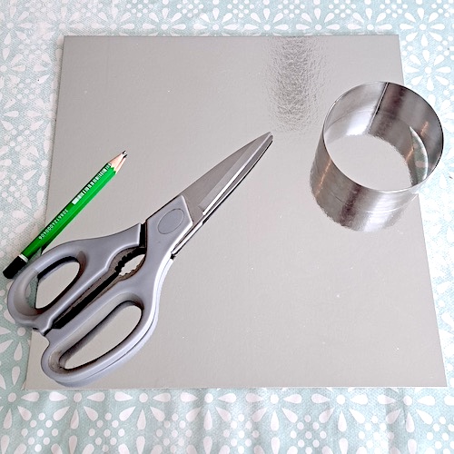 Vous n’avez pas de supports en carton individuels pour vos petits entremets? Utilisez un grand comme je l’ai fait! Il suffit d’y dessiner des cercles un peu plus grands que vos moules et à les découper. (si vous n’avez pas non plus de grand support, du carton recouvert de film aluminium fera très bien l’affaire également 🙂
