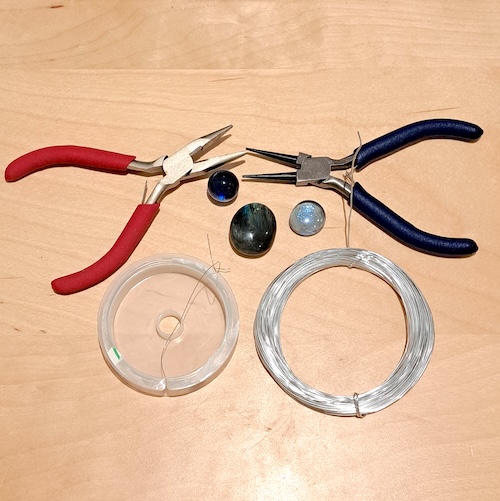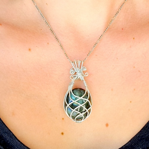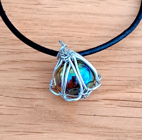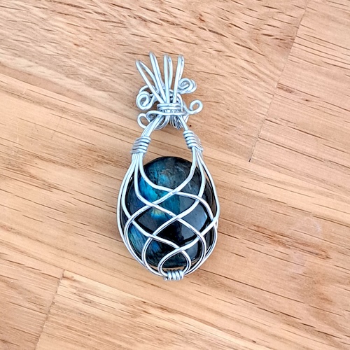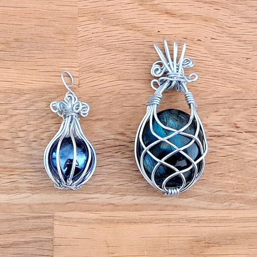 Comme à chaque fois que je teste un nouveau loisir créatif, j’ai commencé par faire des essais en créant quelques pendentifs pour mes filles et moi-même pour me faire la main avant de m’occuper de ma fameuse labradorite. Excellente idée car, bien que “simples” en apparence, beaucoup de ces créations demandent du doigté, parfois plusieurs essais, et, élément essentiel, des fils de métal adaptés (diamètre et matière) pour atteindre un résultat satisfaisant.