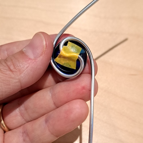 4.Placer le fil que vous venez de plier sur le côté bombé de votre cabochon et maintenir en place à l’aide du papier collant.