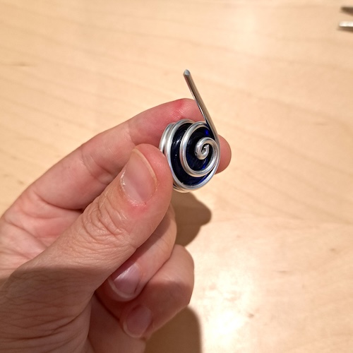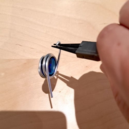 7.A l’aide de la pince ronde, plier le bout d’une des deux extrémités du fil pour former une petite boucle devenant une spirale et assurez-vous qu’elle épouse bien le plat du cabochon.