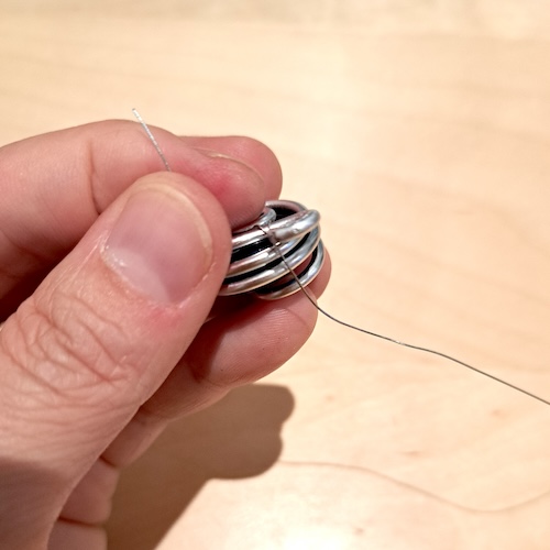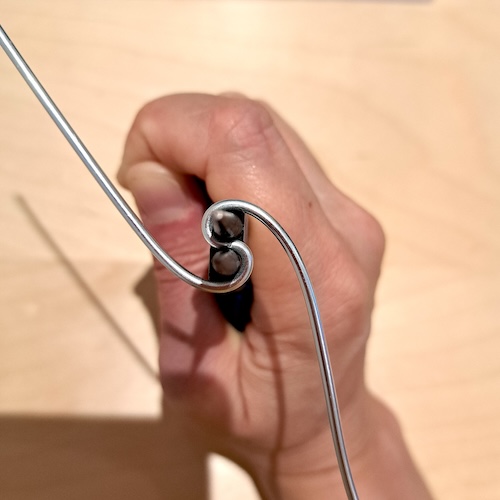 J’ai réalisé mes premiers essais avec du fil de métal que j’avais à la maison et dont le plus épais (2mm) était trop gros. Je me suis aussi rendu compte, après plusieurs tentatives en utilisant du fil qui avait pourtant le bon diamètre, que celui que j’utilisais était en aluminium qui est beaucoup plus souple que les files en cuivre/laiton utilisé dans les vidéos.