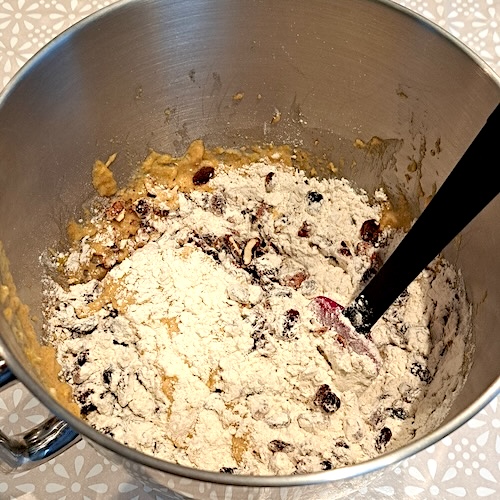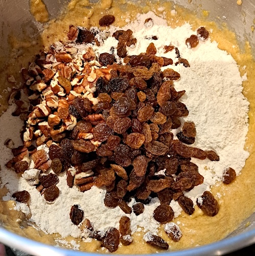 6.Mettre le reste de farine, les noix et les raisins et incorporer à l’aide d’une maryse.