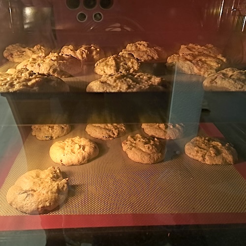 7.Sur une plaque (plusieurs) recouverte(s) de papier cuisson, placer des cuillères de pâte en laissant quelques cm d’espace entre chaque. J’ai tenté de pocher les biscuits à la douille mais ça n’apporte pas grand-chose.