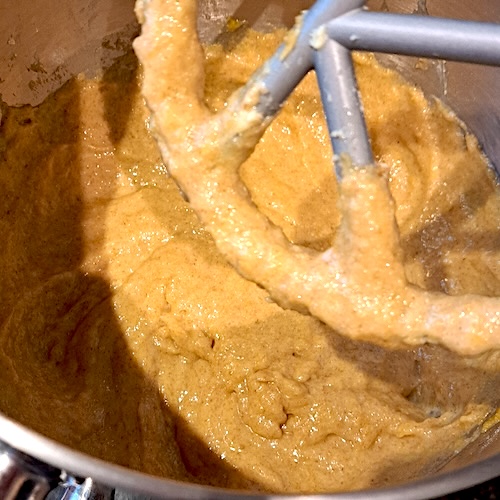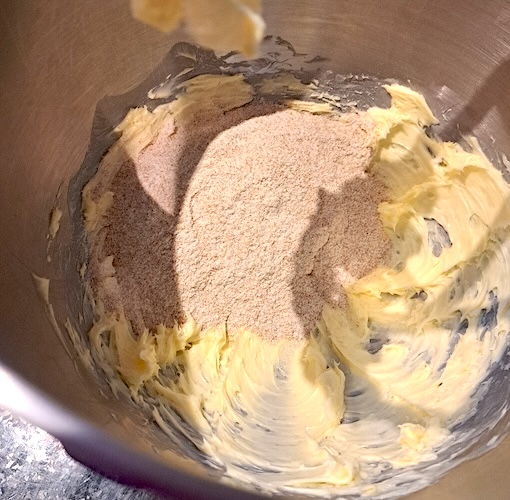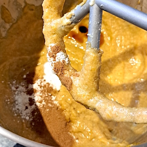 4.Incorporer les épices, l’essence de vanille, la pointe de sel, la levure chimique et le bicarbonate de soude.