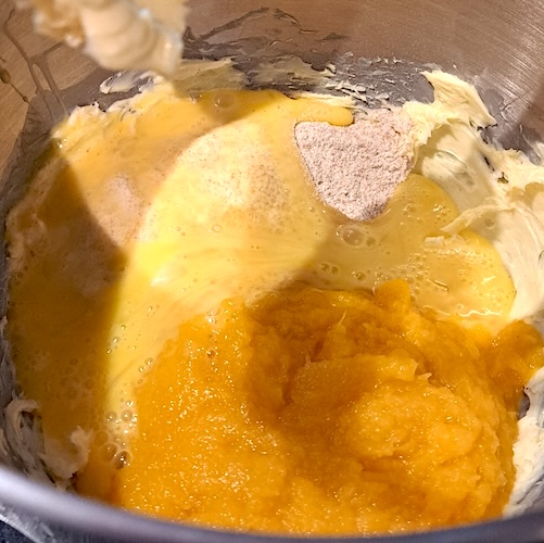 3.Ajouter la moitié de la farine, le sucre, la chair de courge, l’œuf battu et mélanger.