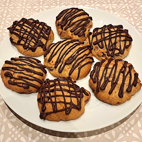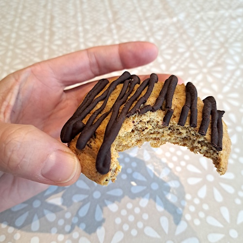 11.Pour plus de gourmandise, faire fondre le chocolat (au micro-onde ou bain-marie), mettre dans une petite poche à douille et décorer les cookies à votre guise. Vous pouvez aussi réaliser un glaçage au beurre ou décorer avec de la glace royale (voir recette ici).