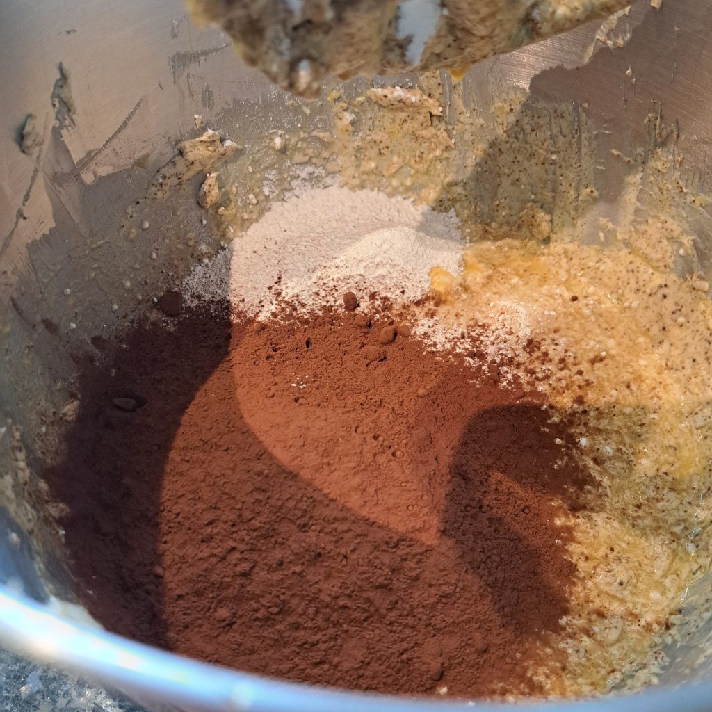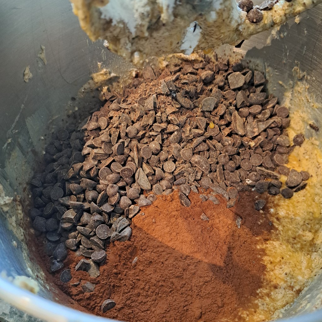3.Ajouter la Maïzena, la levure, le bicarbonate, le sel, l’extrait de vanille et les pépites de chocolat. Pour la version cacao, ajouter également le cacao en poudre.