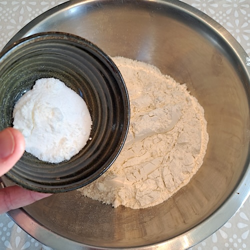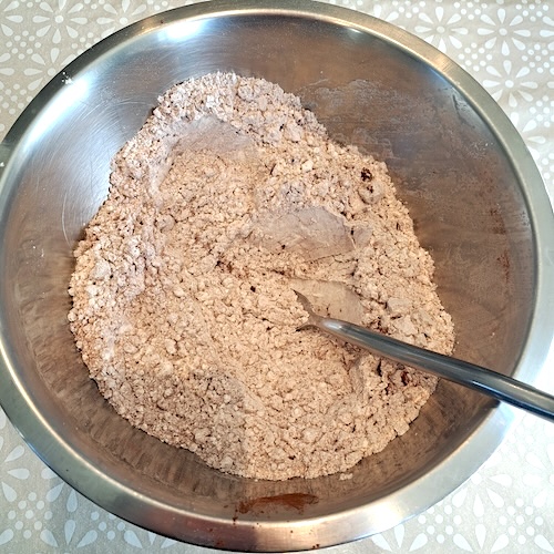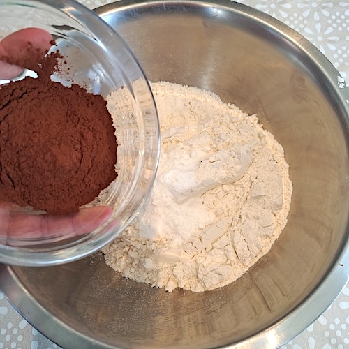 1.Dans un saladier, mélanger les ingrédients secs, soit la farine, le bicarbonate, la levure, le cacao et le sel.