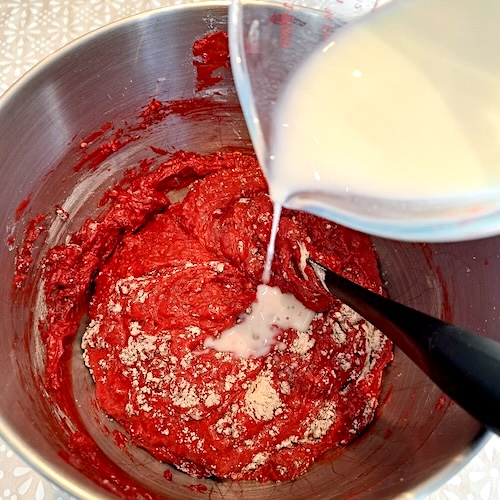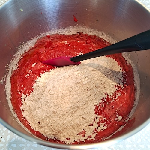 8.A l’aide d’une maryse, incorporer la deuxième moitié du mélange de farine, puis la deuxième moitié du babeurre.
