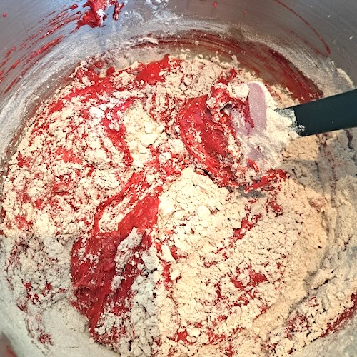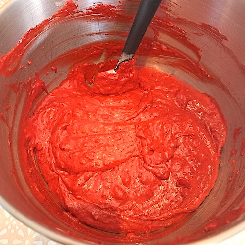 Sa couleur rouge, quant à elle, était à l’origine d’une teinte plus subtile qui était due uniquement à une réaction chimique entre le cacao, l’acidité du babeurre et le bicarbonate. Cette couleur fut ensuite intensifiée grâce à du jus de betterave puis, de nos jours, l’ajout de colorant alimentaire.