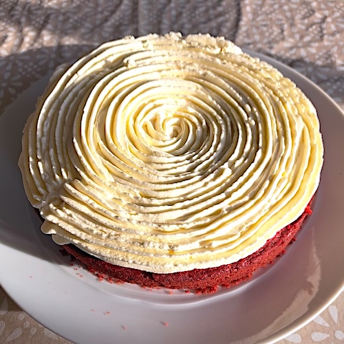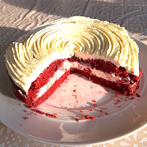 Pour les curieux/ses: le nom de ce gâteau, qui date de l’époque victorienne, ne vient pas de la couleur — qui n’est pas sans rappeler celle des rideaux de velours rouge que l’on trouve sur une scène de spectacle — mais de sa texture veloutée en bouche…