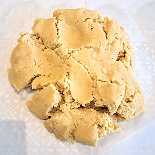 5.Étaler la pâte entre deux feuilles de papier cuisson pour éviter que ça ne colle. Gardez la pâte assez épaisse (environ 1cm d’épaisseur).