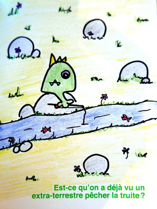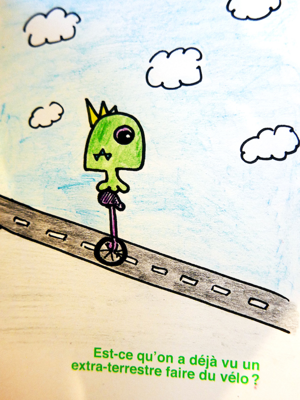 J’ai donc cherché une idée originale d’extraterrestre à mettre en scène sur les différentes pages, en tenant compte du fait qu’il ne devait pas être effrayant, vu l’âge de mon neveu.