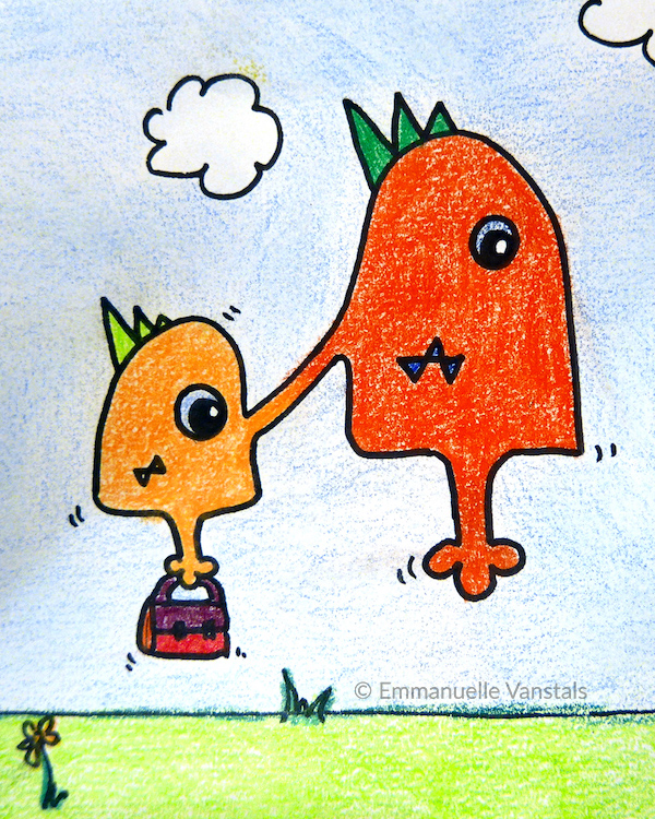 Les deux premiers que j’ai illustrés pour mes filles parlaient, pour le premier, de la vie secrète des bananes quand nous avons le dos tourné, pour le deuxième d’un apprenti magicien qui, ayant mal recopié la formule magique du tableau à l’école de magie obtenait continuellement des résultats inattendus lorsqu’il jetait un sort.